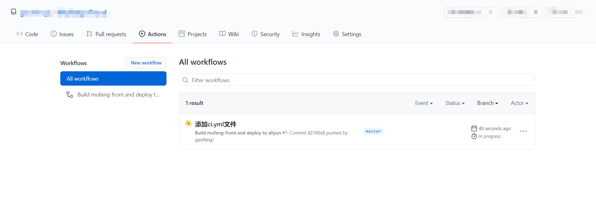 提交后,可以在项目的Actions中查看CI的历史记录。