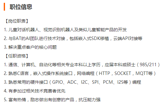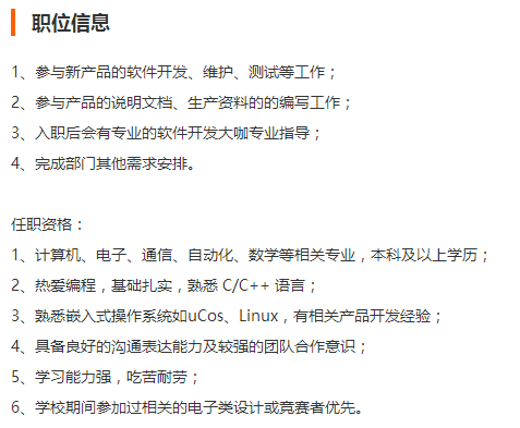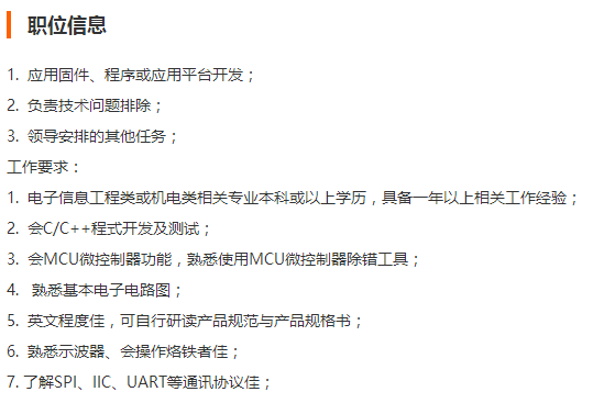 比如有些要求可以在ST、NXP或TI 32位MCU硬件平台软件开发;有些要求会ucos、Freertos、rt-thread;有些要求熟悉Linux内核及驱动开发;有些要求图形开发经验等等。