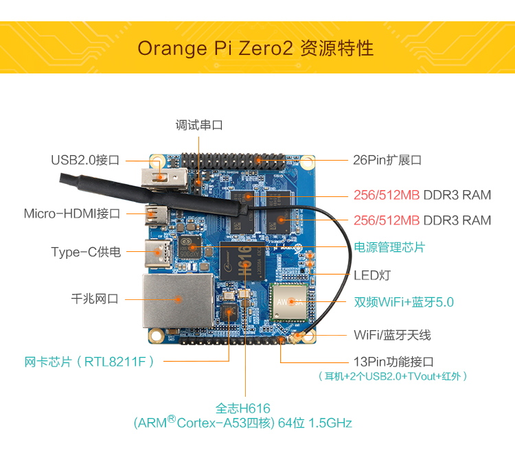 香橙派Zero2开发板采用全志H616 四核 64位处理器,拥有512MB/1GB 内存可选,集成千兆以太网卡、蓝牙5.0+双频WiFi、USB2.0、TF卡槽等端口,并且,Micro-HDMI输出支持4K显示。