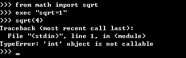 从上面的例子可以看出,exec干扰了命名空间,改变了sqrt的值,使其不是一个函数而变成1了。由此可见,如果对exec不加限制就会存在安全风险。下面是改进措施。