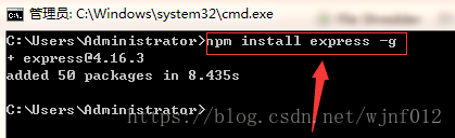 4、在命令行输入以下命令安装express(注:“-g”表示安装到global目录下,就是上面设置的node_global中)