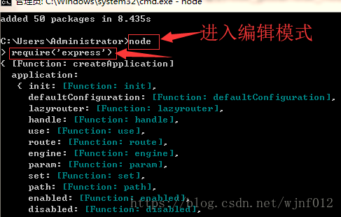 5、在命令行输入node进入编辑模式,输入以下代码检测是否能正常加载模块:require('express')