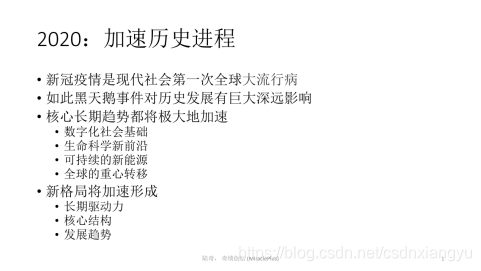 首先,历史进程在加速,新冠疫情是现代社会第一次全球规模的疫情。比尔盖茨先生写了一篇文章,他分析了为什么新冠疫情会带来一个全新的格局。文章的核心是参考黑天鹅事件对历史所造成的巨大影响,黑天鹅事件发生的概率很小,但是对世界影响很大。它的直接影响是,目前已经在发生的几个核心历史潮流都被大幅加速了,原本可能要五年、十年以后才会发生的事情,因为疫情的原因,时间被缩短了,有的现在就开始发生了。