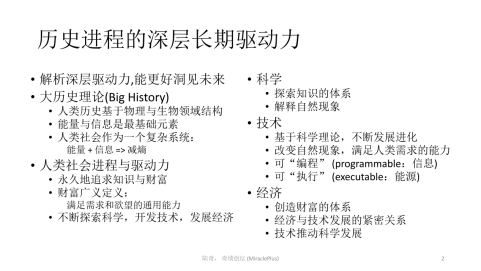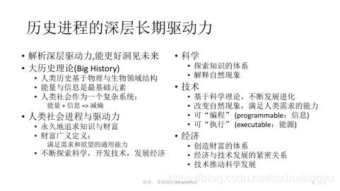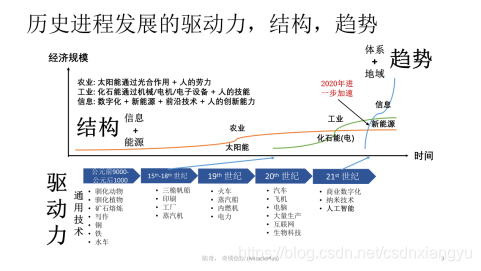 我们先分析一下人类历史的进程,看看它深层的驱动力是什么?这里我推荐大历史理论,其实也是我在微软工作的收获之一。盖茨先生一直推荐我一系列的书,有位作者叫David Christian,他的大历史理论的核心概念是,要研究人类历史、判断未来,起步要看物理世界和生物世界,看它们里面的深层结构是什么?它的核心元素是什么?答案是能量和信息。