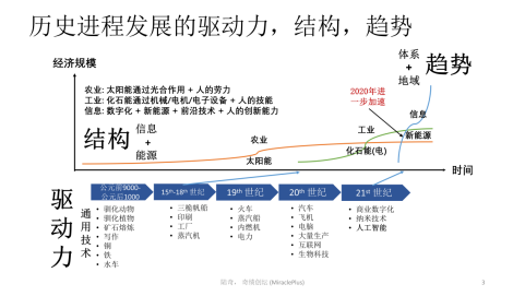 人类历史发展中的经济行为其实在过去几千年一直变化较小,直到在过去三、四百年才产生了加速的变化。核心是因为我们发明了新的体系,信息和能源的结构让我们能够更多地满足人类的需求。下面这张图介绍了人类经历的三个体系,我们现在处在第三个体系,即所谓“新经济”。