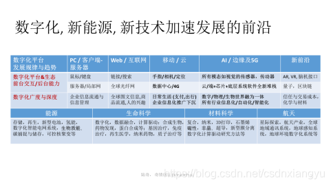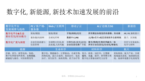 在技术方面,首先我们时代主流的技术驱动因素是数字化技术,数字化技术的发展其实是有规可循的,它基本是由平台来驱动,由数字化的深度和广度而延伸,基本上每隔12年左右会有一个新的平台。(下面这张图基本展示了技术驱动创新前沿的大框架)。