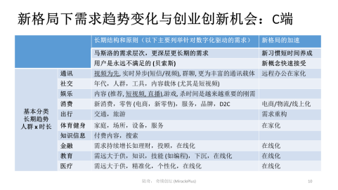 最后还包括教育和医疗。在中国,这两点需求远远大于供给,机会本身就在,用技术或新的方法,更好地满足教育的需求。所以C端我们会建议创业者用系统方法做类似的分析,然后看新的格局下有哪些是被加速的机会。