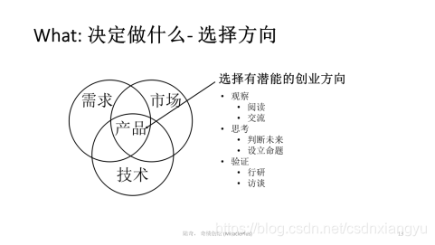 首先决定创业做什么。我们要从需求、技术、市场三个方面做综合的判断,只有三者有交集的地方才是一个好的创业方向(如下图所示)。