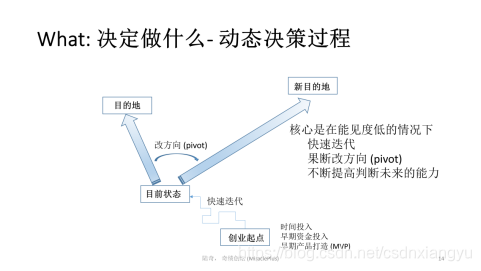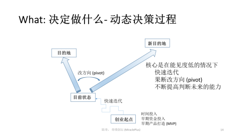 有了MVP以后,就需要小步快跑,快速迭代,这是唯一可以提高创业成功概率的方法。因为早期创业能见度很低,就像你每天打开大门,能见度只有两米,你朝这个方向走,两米之外是陡坡还是悬崖,是桥还是平路,这些你都无法知道,唯一能提高成功率的方法就是赶快试。