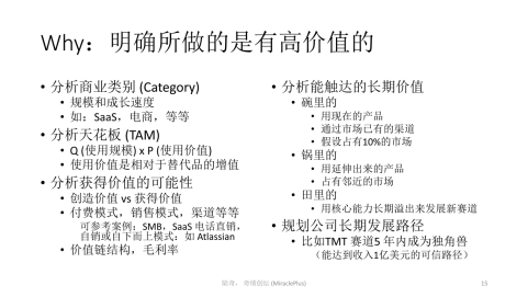 (1)分析商业类别。商业类别分析不是市场分析,市场由需求决定。商业类别是由供给决定的新赛道,叫category(商业类别)。你需要做一个规模和成长速度分析,其中成长速度很重要的一个指标叫年复合增长率(CAGR),我们会建议创业者选择的创业赛道年复合增长率至少30%以上,最好能到50%或以上。反过来说,如果你找到的赛道年增长率小于10%,即使你做得再大,估值也不会很高。