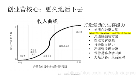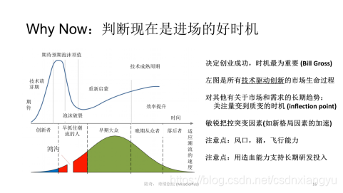 在美国,有一个创业者叫Bill Gross,他做了大量数据分析研究创业成功的要素,结论是创业成功的第一因素是时机,也就是什么时候进场。关于这一点,我们可以看下图,它描述了任何一个技术驱动的创业公司都会经历的曲线。