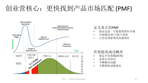 找到产品市场匹配是一个结构性的门槛,且越来越不容易过。因为创业起点是一个好的想法,发明一种技术,用这个技术开发产品,开发完了就切入市场。但是,随着教育的普及、技术的发展,好的点子越来越多,好的发明越来越多,技术和产品开发也越来越快,可每个人一天只有24小时,你就会卡在这里(上图中心位置,PMF),你要找到产品市场匹配,你要切入的市场是越来越拥挤的赛道。