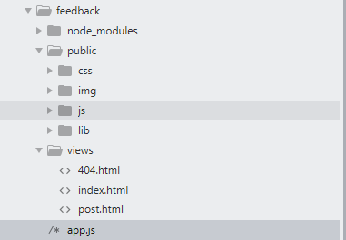 1、项目结构:项目名称feedback ,为了方便管理,将页面内请求的资源统一放到一个公共的public目录下,view中放跳转的页面