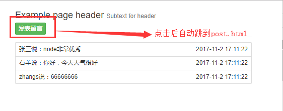 (1)当用户点击发表留言按钮时,自动跳转到post.html
