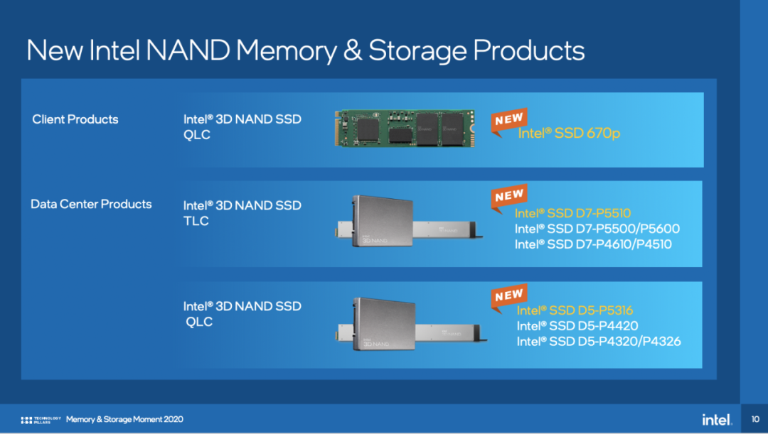 当然,将重心偏向傲腾的英特尔也并没有落下NAND固态盘的创新,此次推出的三款采用144层存储单元的全新NAND固态盘,包括适用于主流计算的英特尔下一代144层QLC 3D NAND固态盘670p;全球首个推向市场的144层TLC NAND设计的英特尔固态盘D7-P5510,以及采用业内首个144层QLC NAND并具备更高密度、更强持久性的英特尔固态盘D5-P5316。这三款全新NAND固态盘代表着TLC和QLC作为大容量固态盘的主流技术正式迈入全新时代。