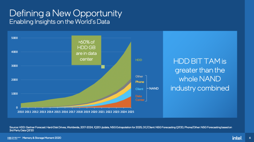 如今,各大存储厂商都在追求创新技术来改变数据存储方式,但目前,硬盘驱动器仍然是存储数据性价比最高的设备。从数据量的角度来说,硬盘驱动器的总体市场规模大于整个NAND行业,而且会持续增长到2025年。不过,从总体拥有成本的角度来看,每GB(千兆字节)固态盘的成本与硬盘驱动器的成本已经十分接近,预计双方最早将在2022年达到一致。