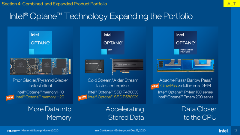 此次活动上,英特尔发布了六款全新的内存和存储产品,三款基于3D XPoint的傲腾系列产品以和三款基于英特尔144层3D NAND的SSD。其中三款傲腾系列产品包括两款新的傲腾固态盘产品——英特尔®傲腾™固态盘P5800X和英特尔®傲腾™H20混合式固态盘,还公布了代号为“Crow Pass”的第三代英特尔®傲腾™持久内存。与此同时,三款全新NAND固态盘也代表着TLC和QLC作为大容量固态盘的主流技术正式迈入了全新时代。