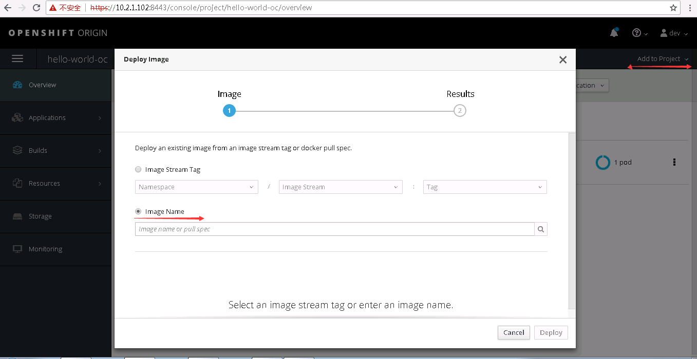 1.3 通过oc new-project 部署一个新项目hello-world-oc