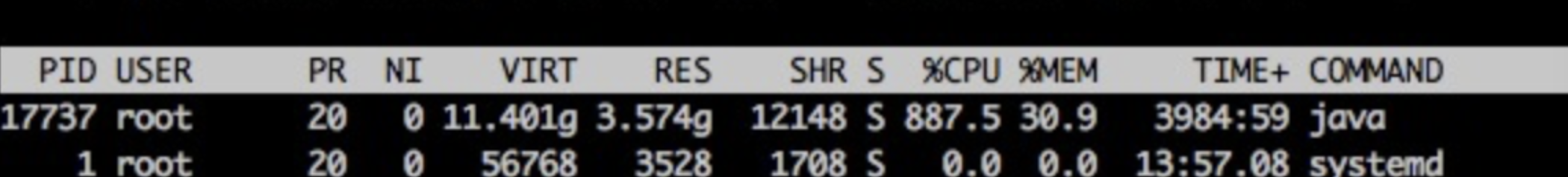 我们的 Java 进程,并不做大量 CPU 运算,正常情况下,CPU 应该在 100~200% 之间,出现这种 CPU 飙升的情况,要么走到了死循环,要么就是在做大量的 GC。
