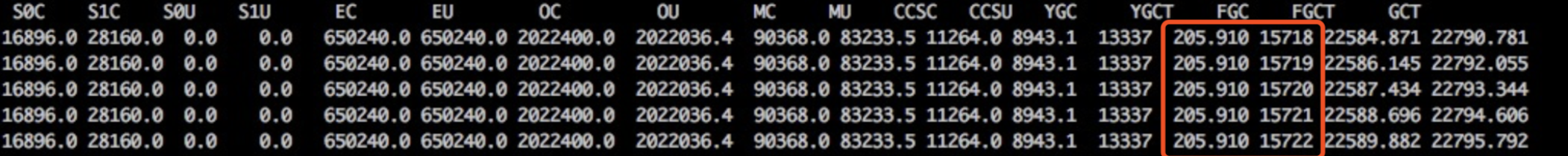 使用 jstat -gc pid [interval] 命令查看了 java 进程的 GC 状态,果然,FULL GC 达到了每秒一次。