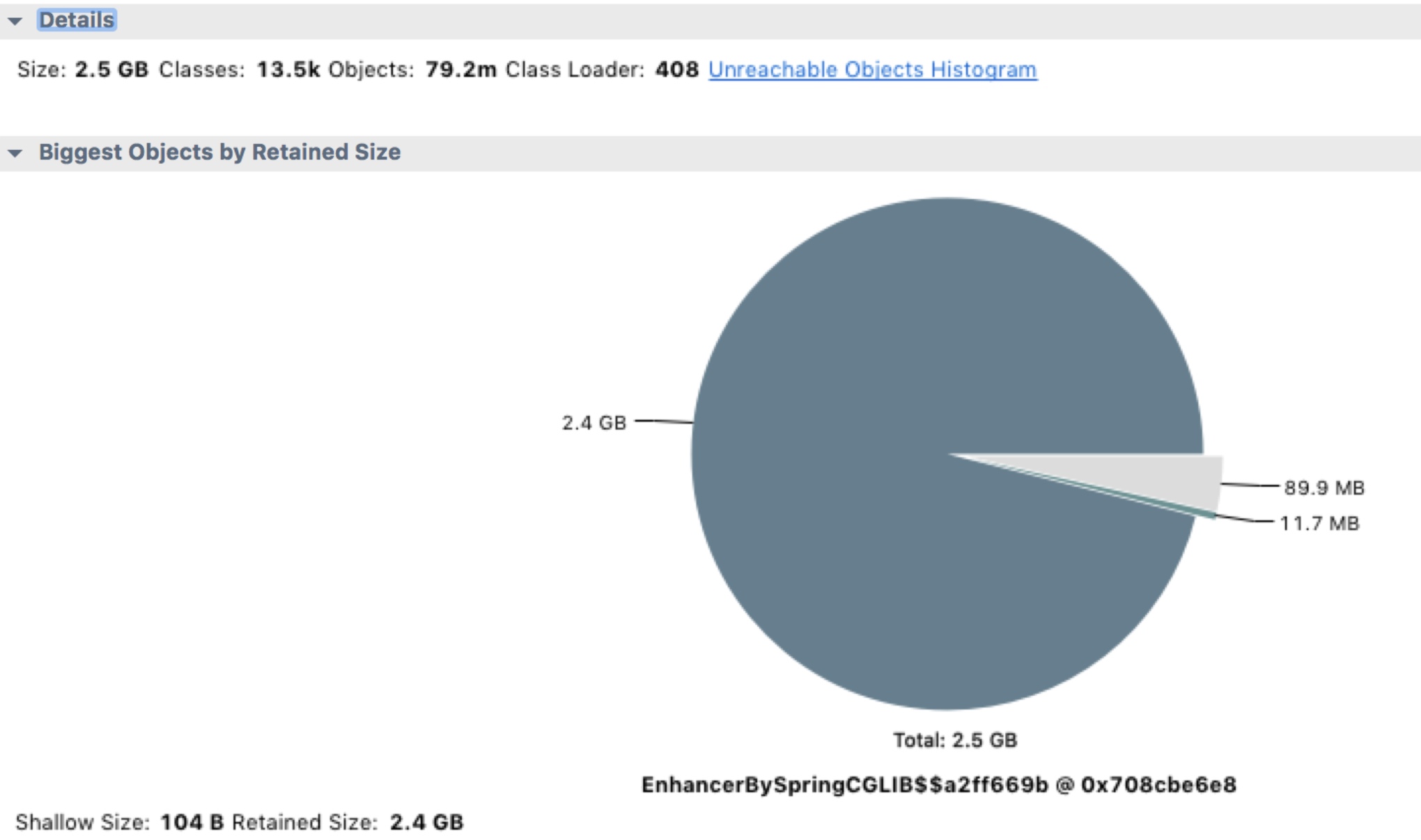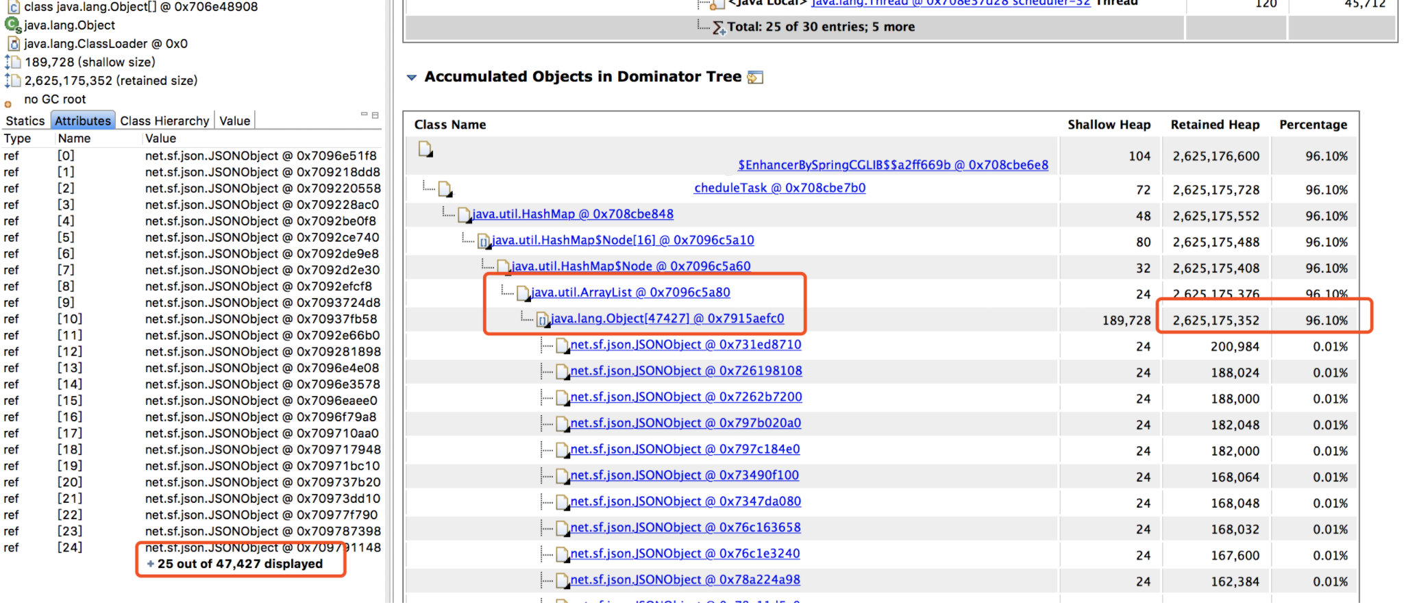 从上面的饼图中可以看出,绝大多数堆内存都被同一个内存占用了,再查看堆内存详情,向上层追溯,很快就发现了罪魁祸首。