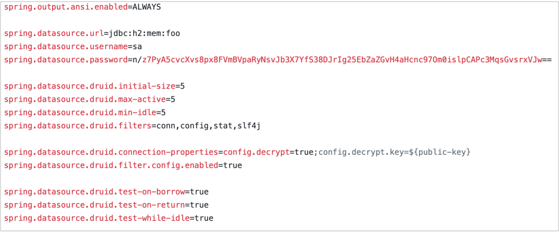 • spring.datasource.druid.connection-properties=config.decrypt=true;config.decrypt.key=<public-key>