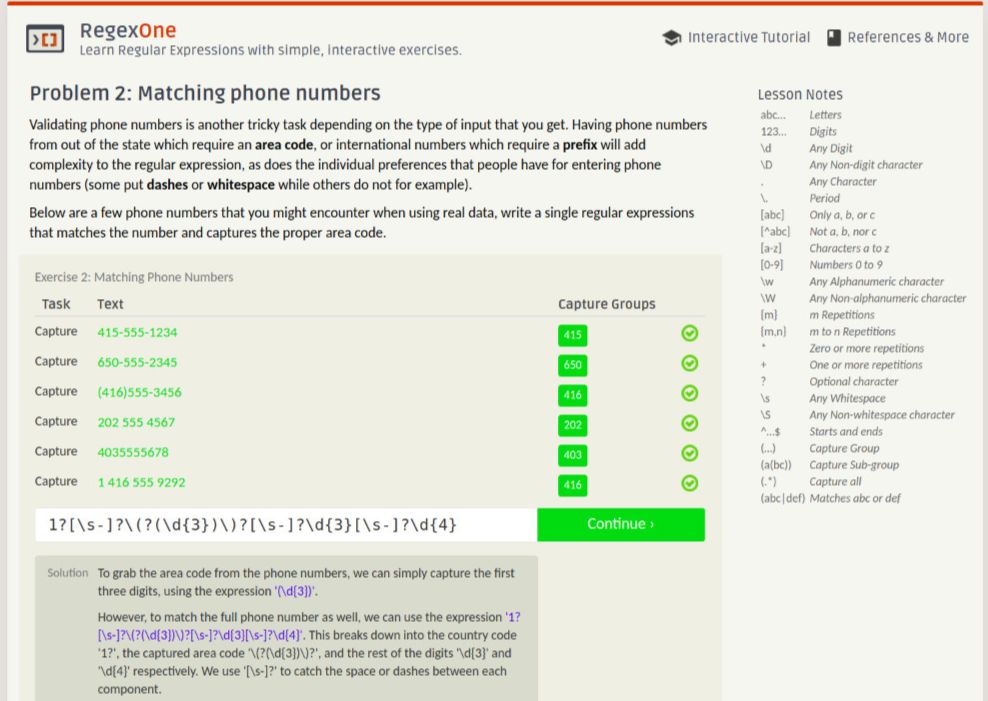 只要写出符合要求的正则表达式,就可以进入下一个问题,关键是每道题还有标准答案,可以点击下面的 solution 按钮查看: