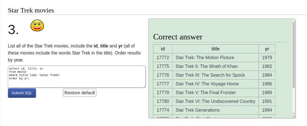 这里都是比较常用的 SQL 命令,给你一个需求,你写 SQL 语句实现正确的查询结果。最重要的是,这里不仅对每个命令的用法有详细解释,每个专题后面还有选择题(quiz),而且有判题系统,甚至有的比较难的题目还有视频讲解: