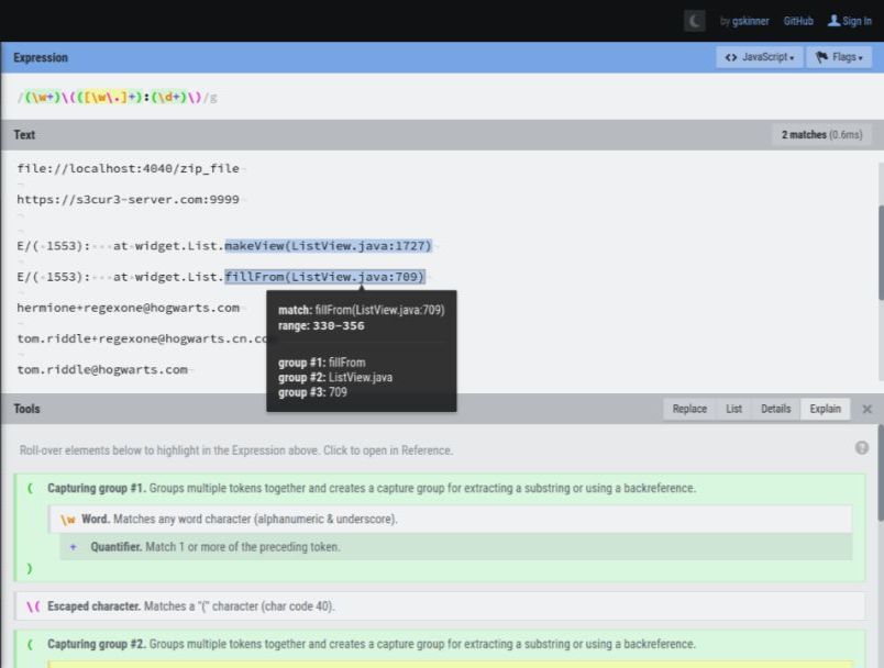 可以看见,输入文本和正则模式串后,网站会给正则表达式添加漂亮且容易辨认的样式,自动在文本中搜索模式串,高亮显示匹配的字符串,并且还会显示每个分组捕获的字符串,下方还会给出每个通配符的含义。