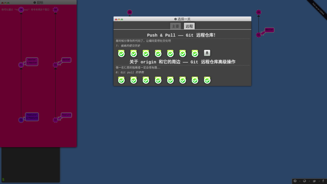 所有 Git 分支都被可视化了,你只要在左侧的命令行输入 Git 命令,分支会进行相应的变化,只要达成任务目标,你就过关啦!网站还会记录你的命令数,试试能不能以最少的命令数过关!