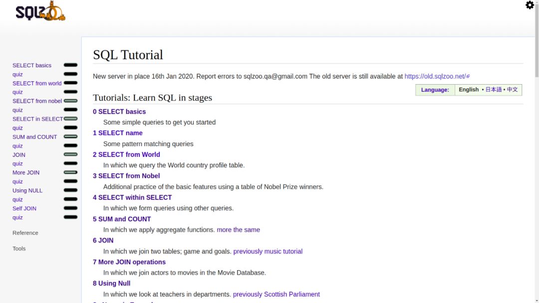 SQLZOO 是一款很好用的 SQL 练习平台,英文不难理解,可以直接看英文版,但是也可以切换繁体中文,比较友好。