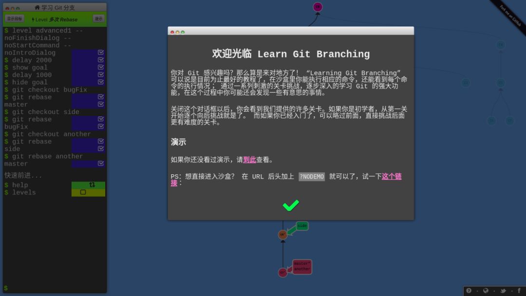 总之,这个教程很适合初学和进阶,如果你觉得自己对 Git 的掌握还不太好,用 Git 命令还是有运气成分,就可以玩玩这个教程,相信能够让你更熟练地使用 Git。