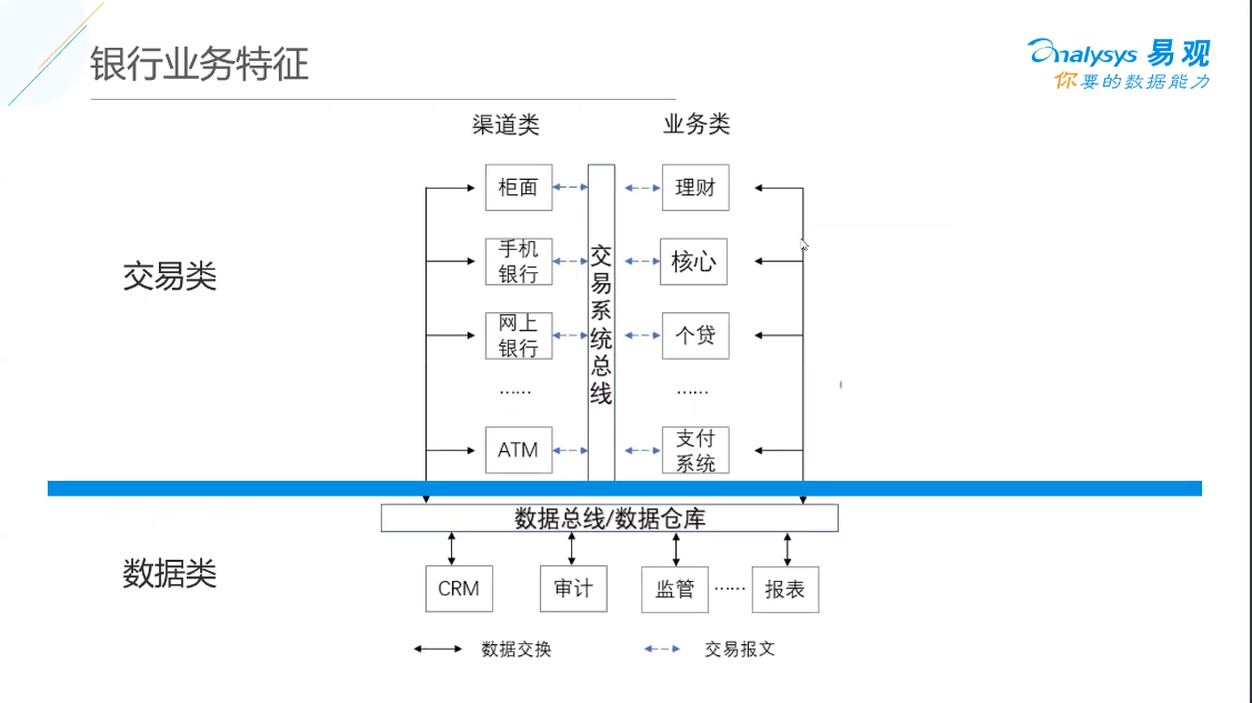 上图罗列了银行的业务特色。对银行来说,它们业务层面主要是交易类的,主要分为两条线,包括渠道和业务。