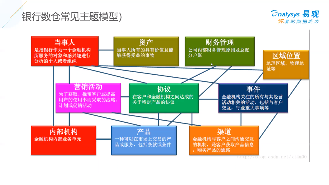 如上图所示,这些是银行数仓的常见主题模型,一共是十个:当事人、资产、财务管理