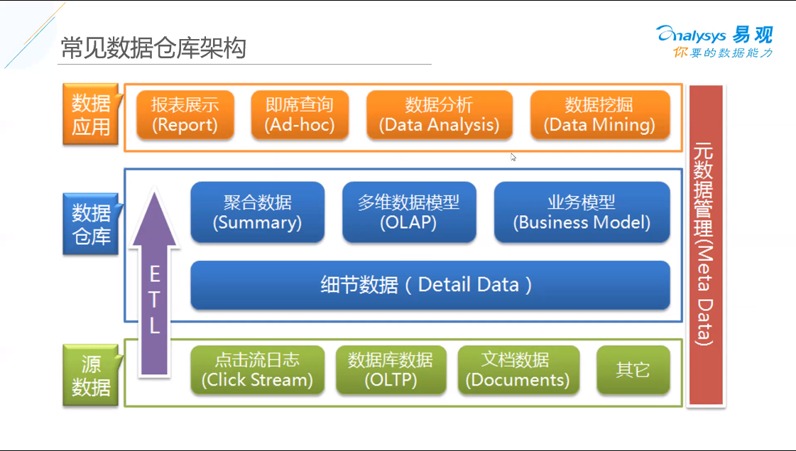 如上图所示,这是一个比较常见的数据仓库的架构。它的层级十分清晰:从数据源的采集到ODS那一层,再到数据应用层。最上面的那一层就是应用层,比如报表分析、即席查询等。