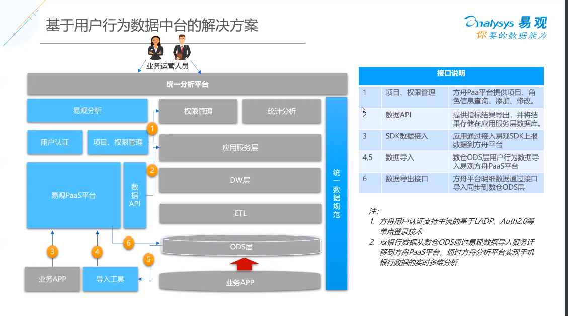 由于银行业的复杂性,会接入非常多的数据源,因此这一解决方案主要针对上层进行整合。易观技术服务团队通过在接口层面开放权限管理和项目管理,银行工作人员便可以通过自己的管理权限界面在我们接口,保证了不同模块在权限管理层面的统一。项目同样如此。