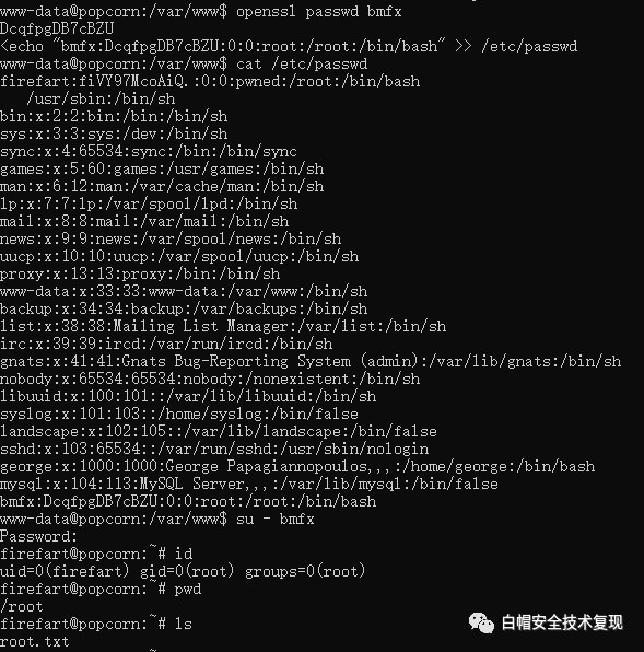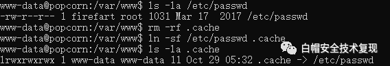 上述触发成功,发现/etc/passwd的权限已经被更改为www-data,那么就可以使用当前用户直接更改此文件添加用户进行提权,下面是添加用户提权的操作