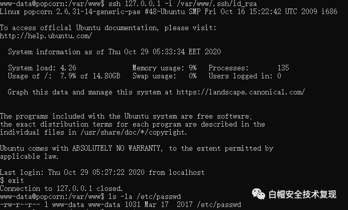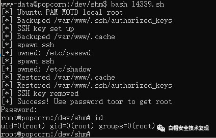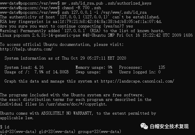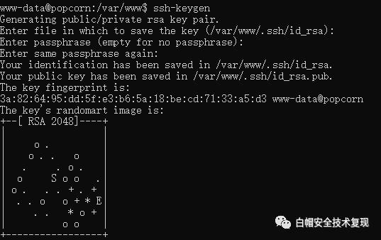 上述代码执行之前需要手动通过ssh-keygen生成公钥和密码,不这么做的话,我刚开始执行的时候会让你输入当前反弹shell用户www-data的密码,反弹的shell当然不知道密码所以没法继续,原因也是对应的exploit里面在执行的时候先默认你含有公钥和私钥然后去触发漏洞去连接目标靶机,然而没有私钥和公钥当然会让你输入密码了