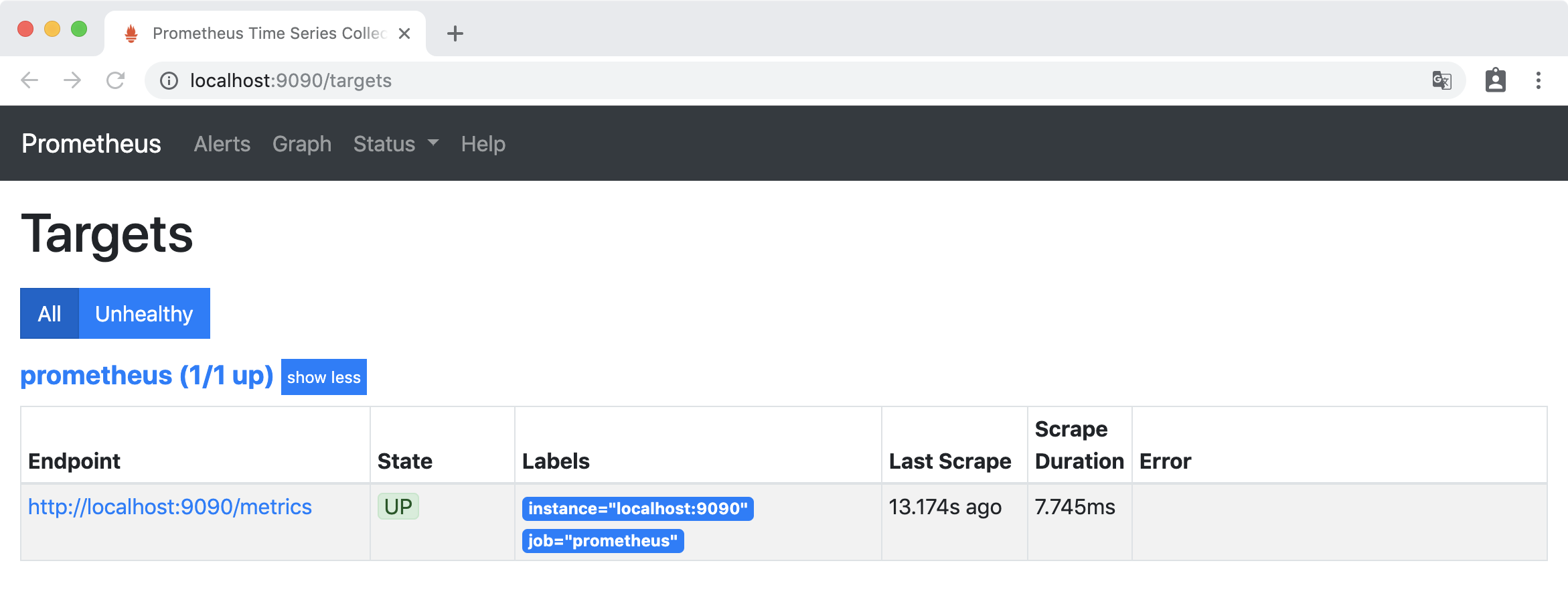 最后一个块scrape_configs控制 Prometheus 监视的资源。由于 Prometheus 还将自己的数据公开为HTTP端点,因此它可以抓取并监控自身的健康状况。在默认配置中有一个名为 prometheus 的job,它抓取 prometheus 服务器 公开的时间序列数据。该作业包含一个静态配置的目标,即端口9090上的本地主机。返回的时间序列数据将详细说明Prometheus服务器的状态和性能。
