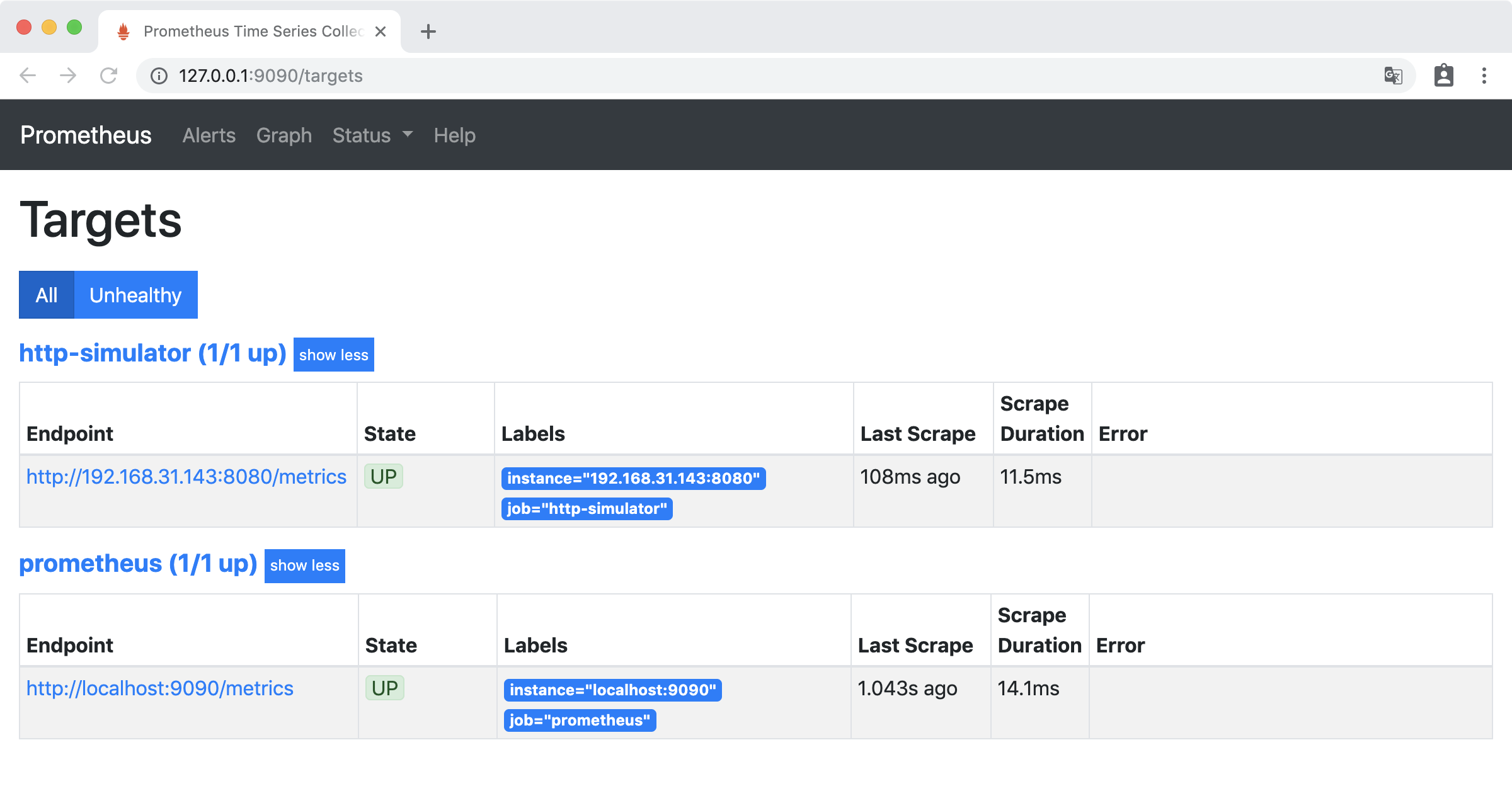访问 http://localhost:9090/targets ,发现已经出现了 target “http-simulator” ,并且为UP状态。