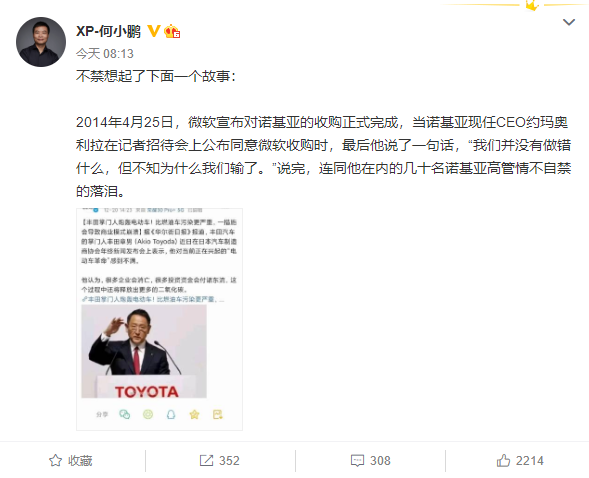 对于丰田章男的发言,12月21日小鹏汽车董事长何小鹏在微博中贴出了新闻截图,并配文称:"2014年4月25日,微软宣布对诺基亚的收购正式完成,当诺基亚现任CEO约玛奥利拉在记者招待会上公布同意微软收购时,最后他说了一句话,'我们并没有做错什么,但不知为什么我们输了。'说完,连同他在内的几十名诺基亚高管情不自禁的落泪。"