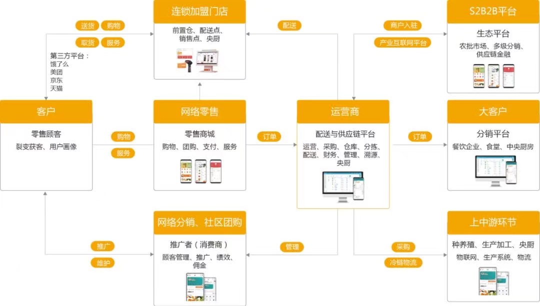 农产品生鲜(食材)数字化商业平台业务流程包含:连锁加盟门店、网络零售商城、网络分销、社区团购等多触点,同时整合农产品配送与供应链。