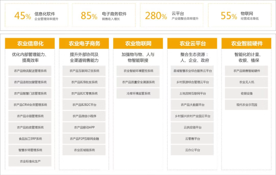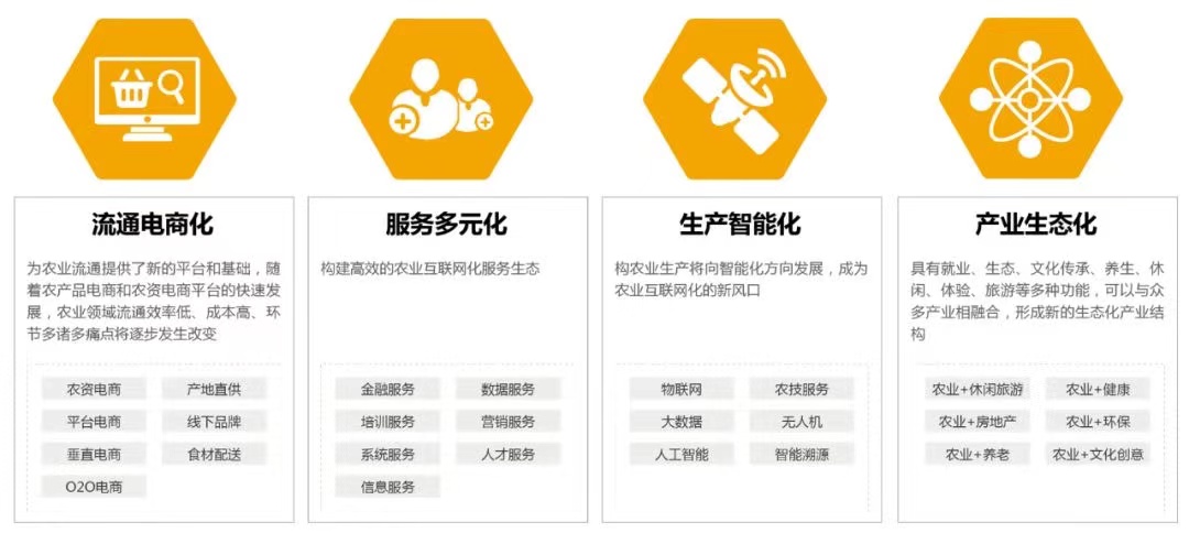 未来随着互联网与农业全产业链的进一步融合,农业互联网化创新模式不断涌现,主要方向包括流通电商化、服务多元化、生产智能化和产业生态化。