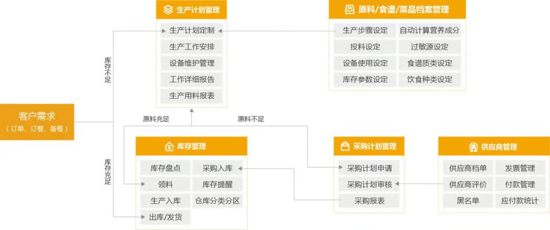 系统特点:1、投料标准化:精准记录每一种原料及配料投放顺序、投放数量、过敏源等,出品品质统一,自动计算食谱标准份及每100克营养成分;2、生产标准化:详细记录食谱每一步生产时序、步骤、设备、使用时间温度等,新员工培训成本低、出事可替代性强,生产领料精确,无差错,减少浪费;3、管理智能化:根据生产计划自动生产工作安排,生产工作内容一目了然,人力成本降低,采购、生产、出入库一体化管理,无缝衔接,库存成本降低;4、统计自动化:根据客户订单和库存自动统计生产需求、采购需求、领料需求,自动分析菜品成本、自动生成库存预警,管理工作简化、效率提升。