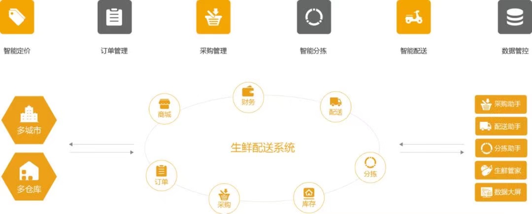 生鲜配送系统功能包含:智能定价、订单管理、采购管理、智能分拣、智能配送、数据管控等。支持多城市、多仓库配送,线上与线下互通,配送效率更高。