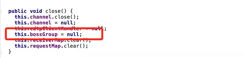 在close方法中,确实把NioEventLoopGroup置为null了,对于一个普通的对象来说,只要对象引用为null,那么在下次JVM垃圾回收的时候,就会把这个对象回收掉。但是对于一个线程池对象来说,因为线程池中有活动线程存在,所以尽管置为null了,JVM也不会回收这个线程池。一般的线程池对象,都是通过shutdown方法来销毁线程池的。