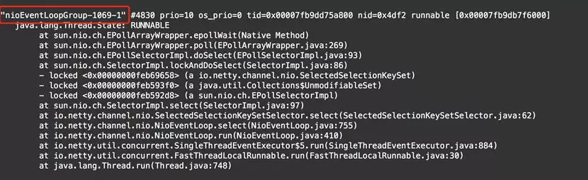 打开thread.log看了下,线程状态倒没啥问题,但是堆栈中有大量的nioEventLoopGroup线程,看编号有1000+,通过命令统计了下,确实有1000+个nioEventLoopGroup线程。