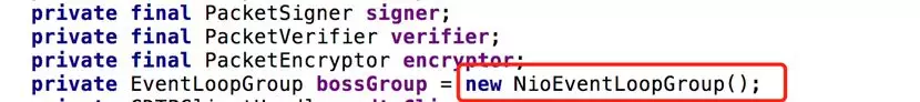 看名字这俩对象都是netty框架中的类,在网上查了下资料,“NioEventLoopGroup”是netty中的一个线程池对象。