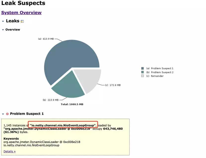 在分析页面中可以看到,io.netty.channel.nio.NioEventLoopGroup对象占用了JVM中61.36%的空间。其次是io.netty.buffer.PoolThreadCache对象,占用了21.38%。
