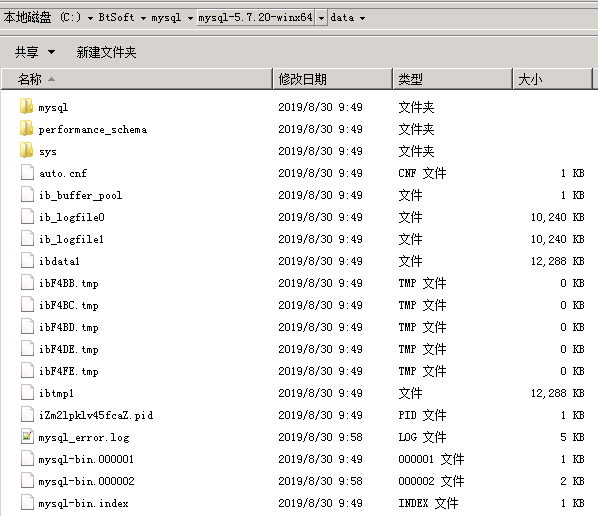 执行后无输出,此时之前在my.ini文件中定义的data路径中,已经自动初始化了若干个文件,如图